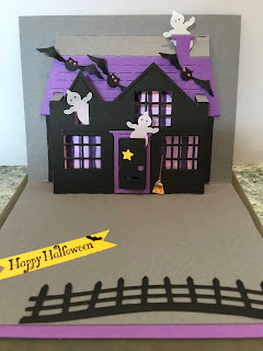 I do love to make Halloween cards. I knew when I saw the Pop Up House thinlit set in the annual catalog I wanted to make a haunted house. Not a scary one of course. Any way this is what I ended up making. I only found two You Tube videos to research for help with the pop up part. There may be more now. I'm pretty happy with the way it turned out. By the way....this one is practice card number three. The first two...were learn from my mistakes cards!